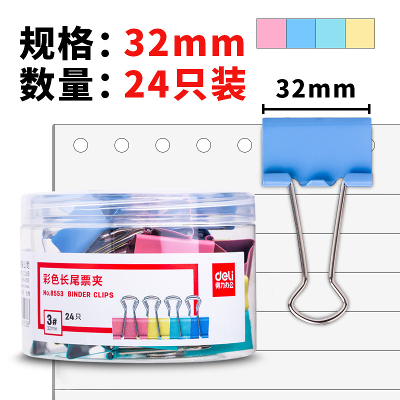 得力8553彩色長尾夾3#32mm24只
