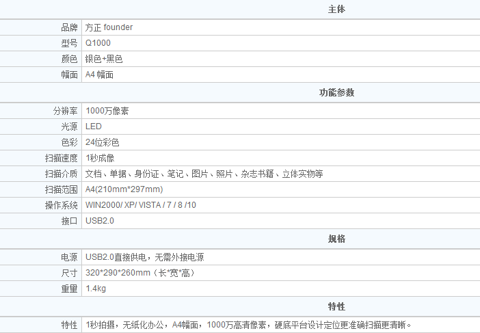 • 商品名稱:方正(Founder)Q1000 高拍儀掃描儀 1000萬像素 A4
